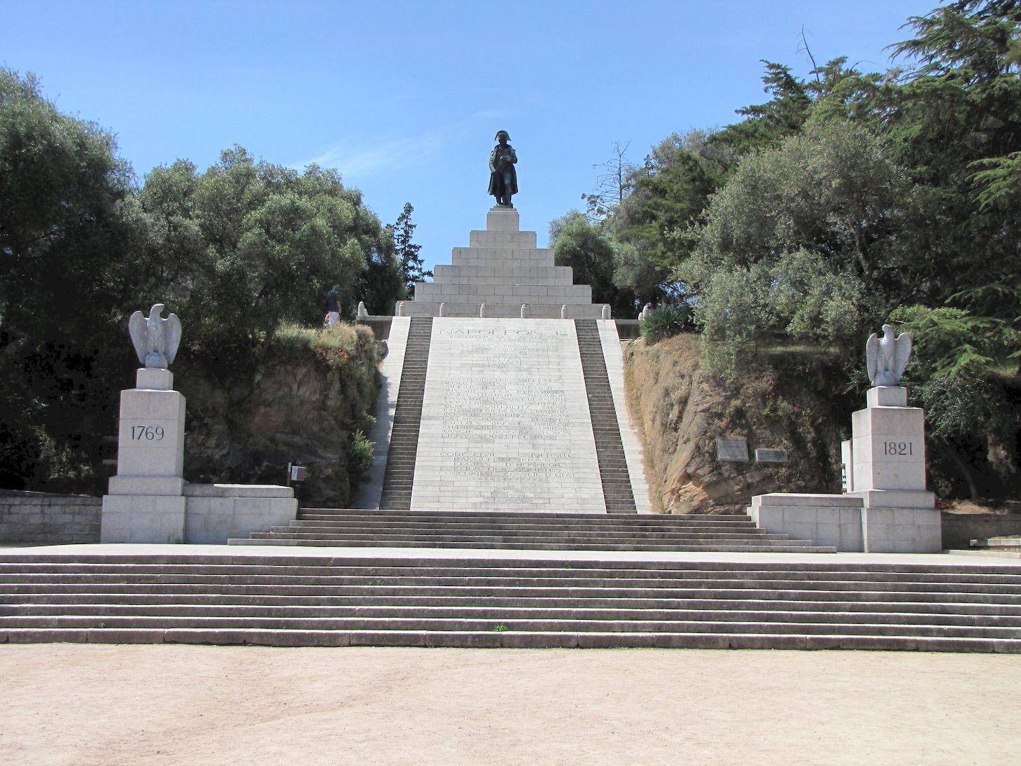L’empereur est vêtu de sa redingote et coiffé de son bicorne. En bas, deux aigles indiquent ses dates de naissance et de décès. Elle est l’œuvre du sculpteur Seurre en 1938. Sur la gauche, se trouve la grotte dans laquelle, le jeune Bonaparte venait se retrancher pour réfléchir.