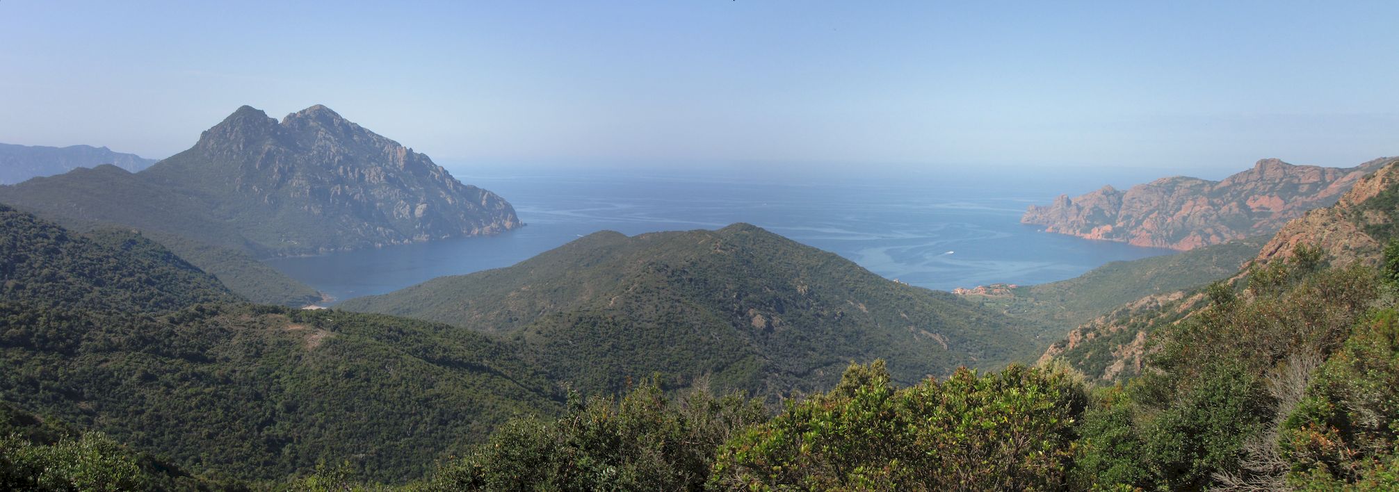 Depuis ce col la vue est encore plus belle et le rouge des rochers sur la mer lui donne un aspect violet. De l'autre coté c'est le golfe de PORTO qui apparaît avec un autre paysage en perspective.